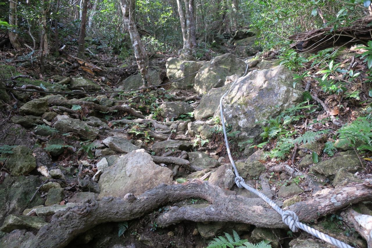 ロープを頼りに登っていきます。相当傾斜があります。日差しもあり汗をかきながら歩いていきます。他に人は全くいません。