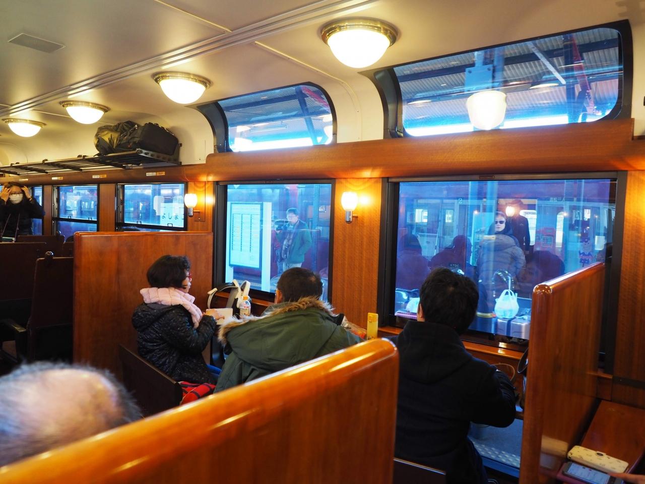 車内の様子。展望スペースがあるあたりはこれまで乗ってきた「かわせみやませみ」や「いさぶろう・しんぺい」と似ていますね。と言うか、「いさぶろう・しんぺい」のボックスシートを特急向けのリクライニングシートに変えたというのがしっくりくるかな。登場時期同じくらいでしたもんね。