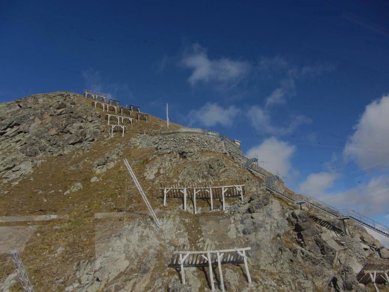 ピッツ.ナイルのロープウェーで降りた近くでは、北側に33m高いピッツ.ナイルの山頂が聳えているので、360度の展望とはいきません。そこで山頂への登頂を試みました。ただ瓦礫で足場が悪く、シニアには無理そうなので諦めました。18日前にエッギスホルン山頂や7日前のメンリッヘン山頂への登頂に次いで3回目の残念となりました。