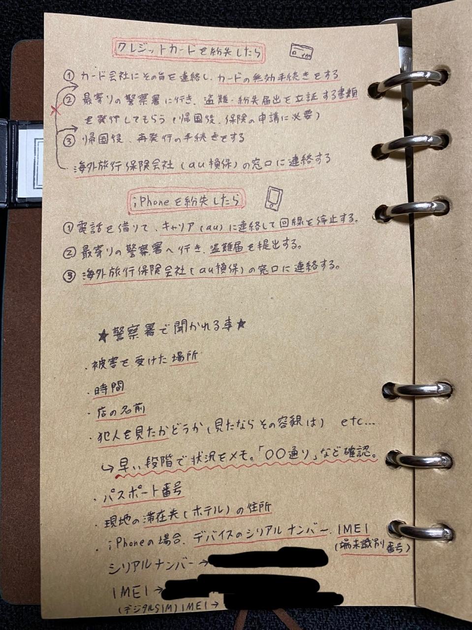 ・トラベラーズノート(緊急時の対処法と連絡先全部メモしてある)