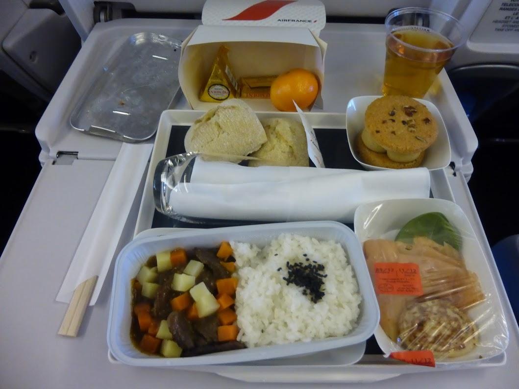15時(フランス時間)頃、機内食、テーブルの奥行きはエコノミーより広いかも?