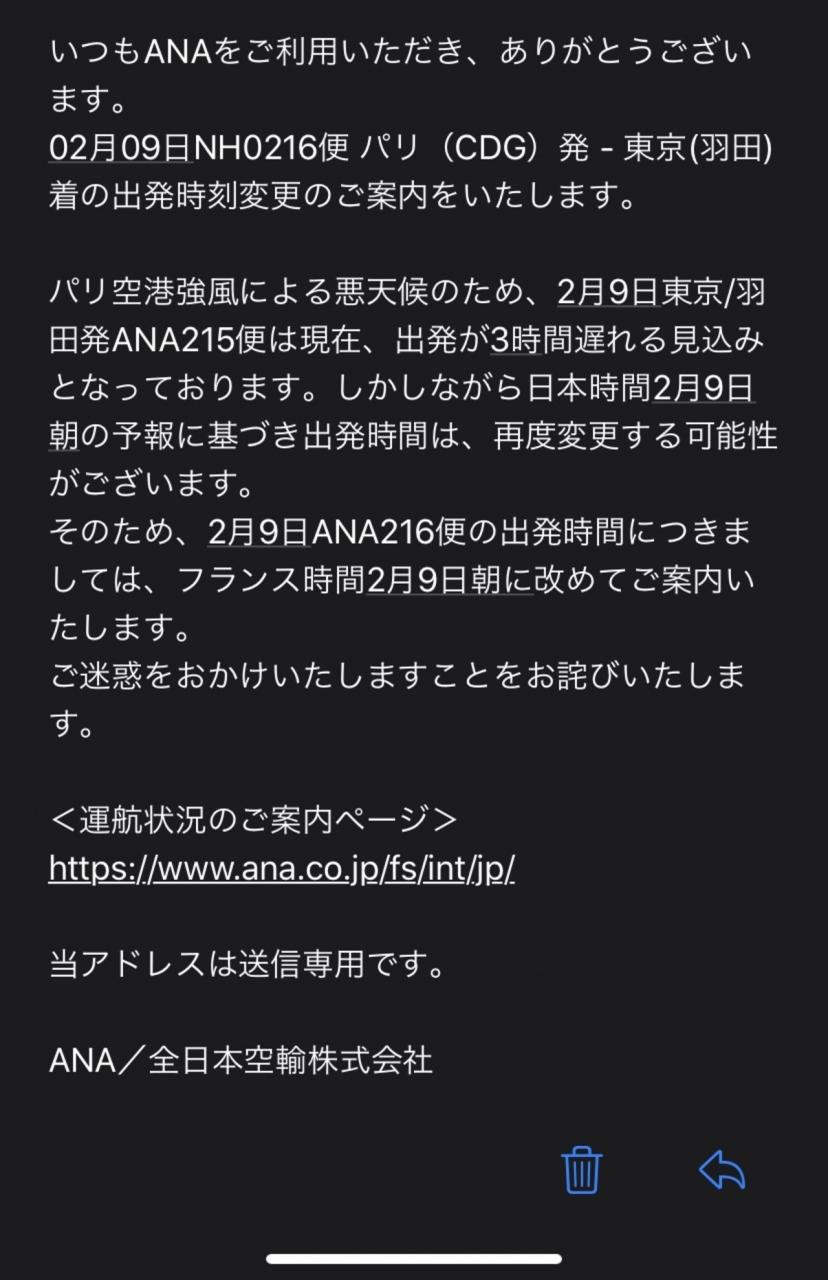 深夜2時、ANAから、 一 日 遅 延 のお知らせメールが。