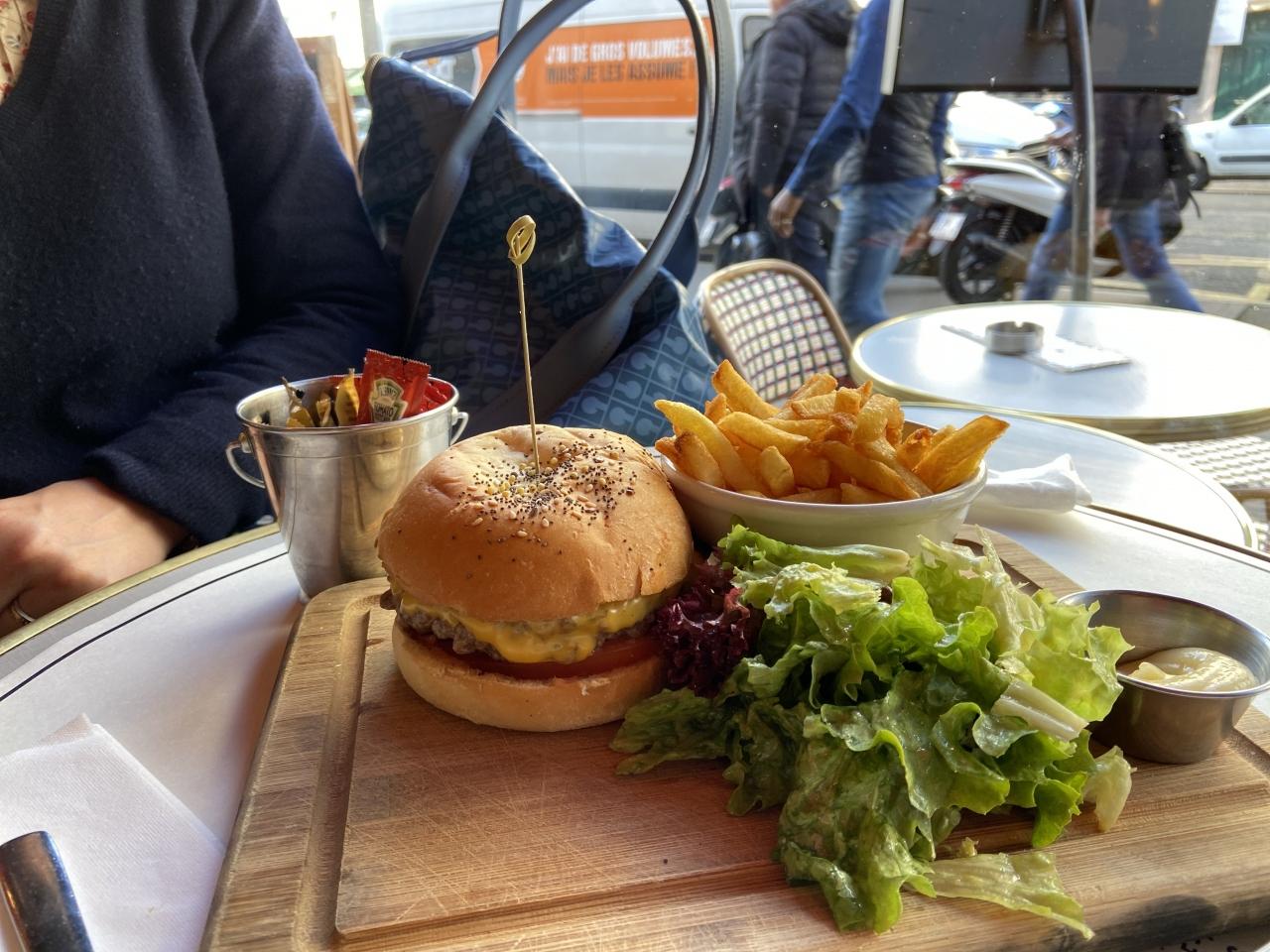 パリ最後の食事はホテル近くカフェでハンバーガー。毎日お店の前を通っていながら入ったことのなかったカフェ。食事をしようという目で改めて見てみるとお客さんの大多数がハンバーガーを食べていて、美味しそう。