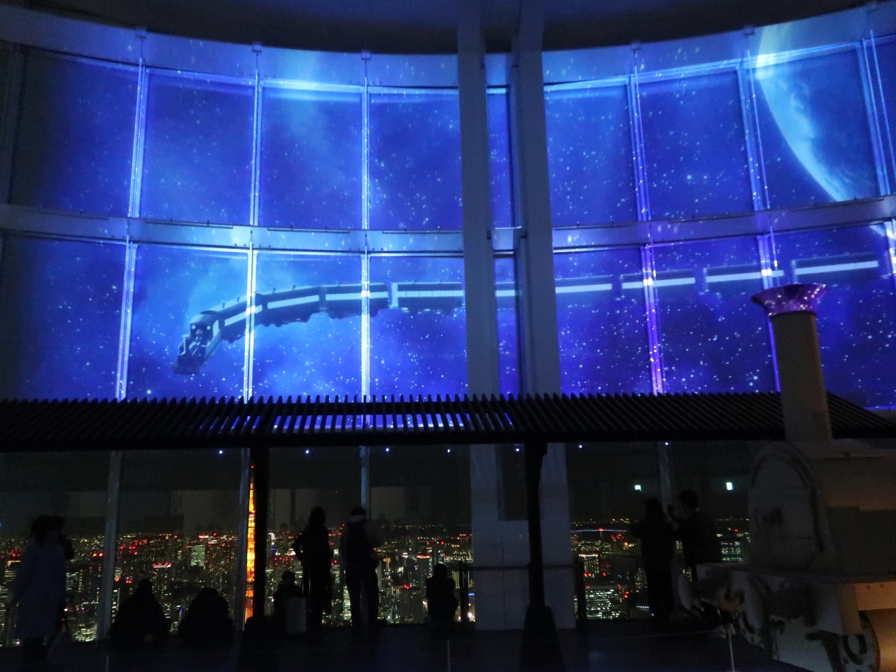 日没後から、展望窓は巨大スクリーンに変わり、銀河鉄道が走り廻る。