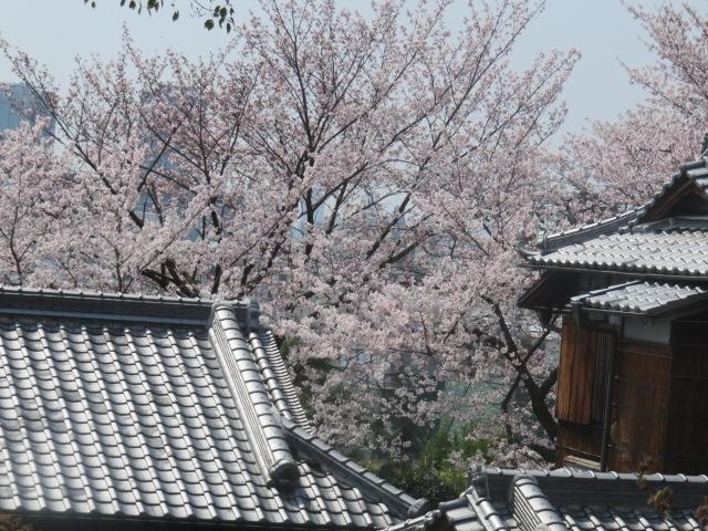 屋根越しに満開の桜の花。