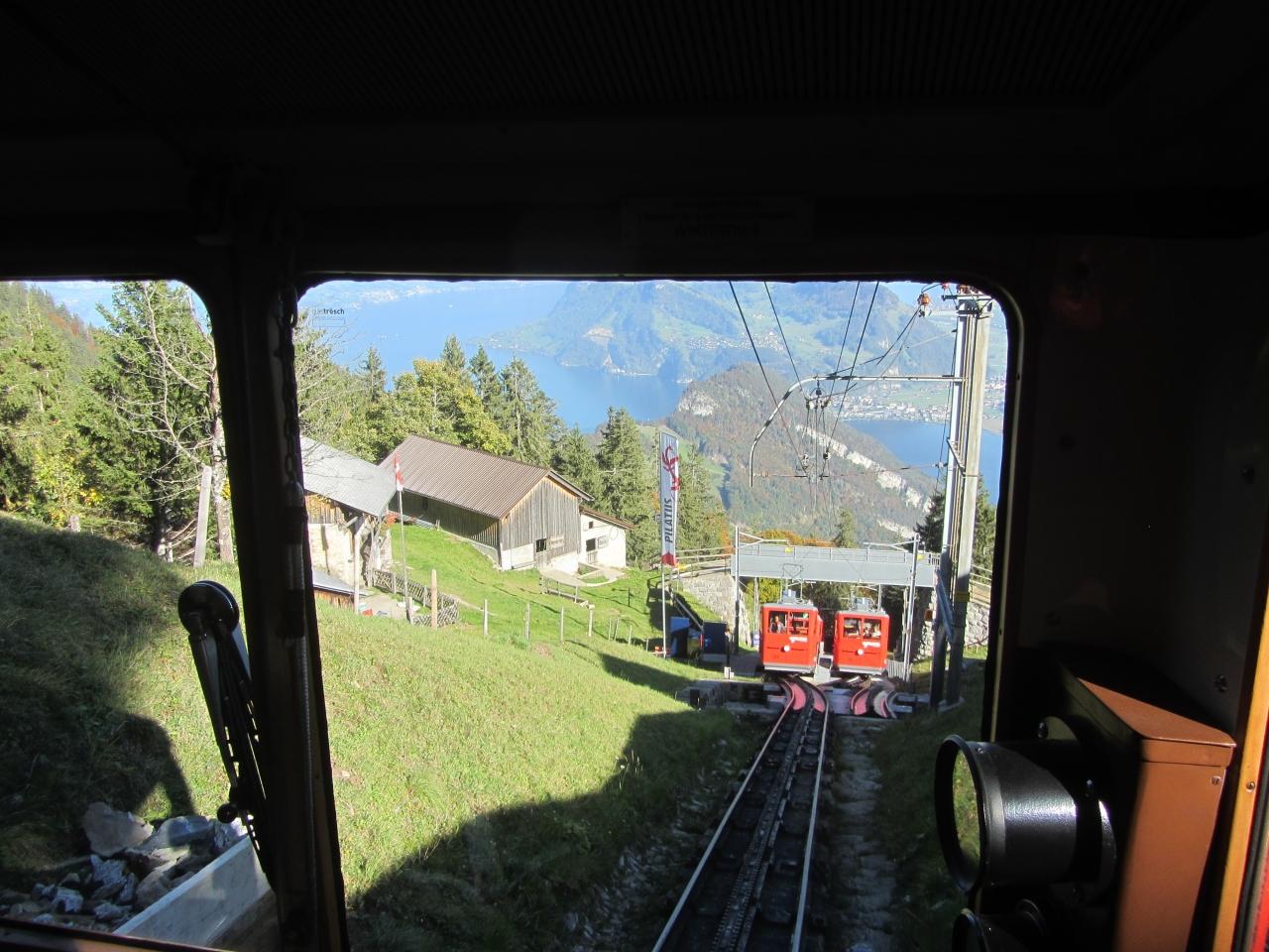 ピラトゥス周遊には、上りはこの登山電車に乗り、下山は北側にロープウェーを乗り継いでルツェルン西地区のキーンスに降り立つ切符を買いました。