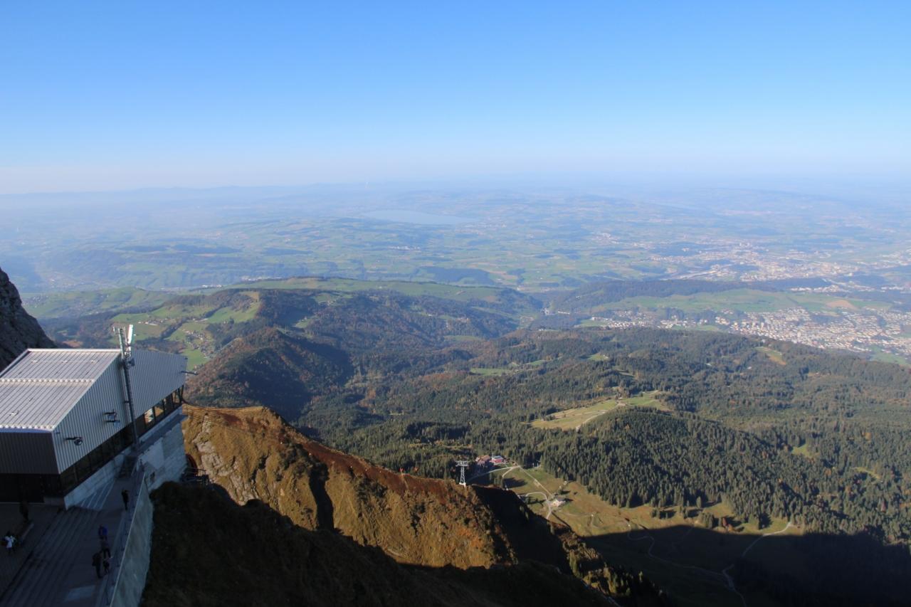 北北西の方向に、ルツェルンに下りるロープウェーの中継地であるフレクミュンテック(Fräkmüntegg:1412m)を見下ろします。