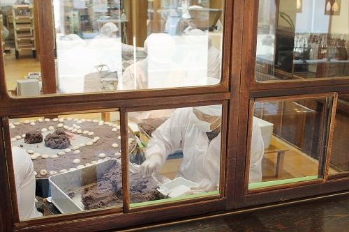 その横で女性が餅に餡を付ける作業に取り組んでいました。 -
