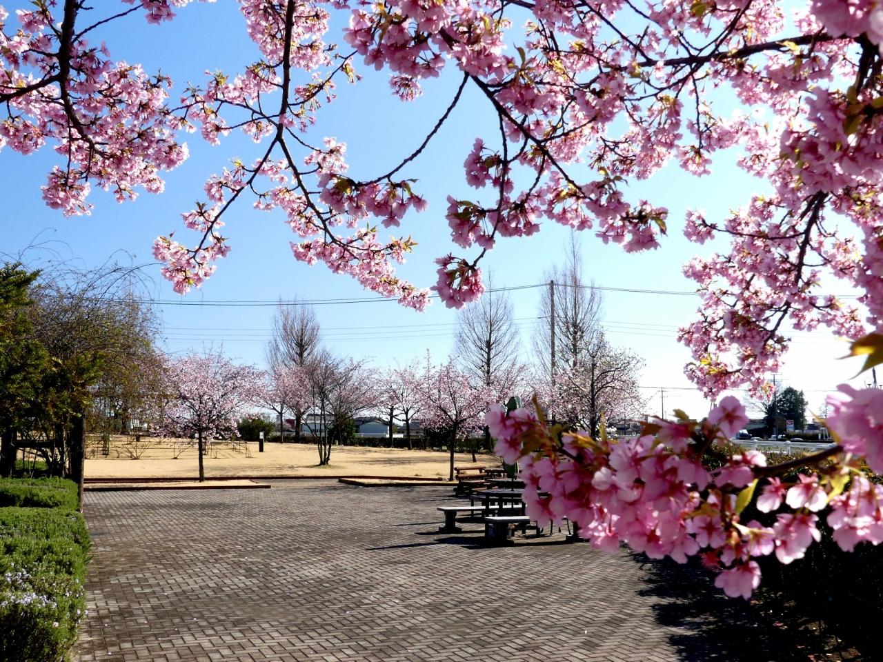 熊谷市妻沼の「道の駅めぬま」へ、河津桜を見に行きました。ここは立派なバラ園で知られていますが、その周囲に植えられた河津桜が満開になっていました。
