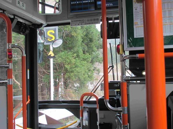 このバス、窓に貼られたステッカーが大きすぎて景色が大きく遮られるのはちょっと残念。
