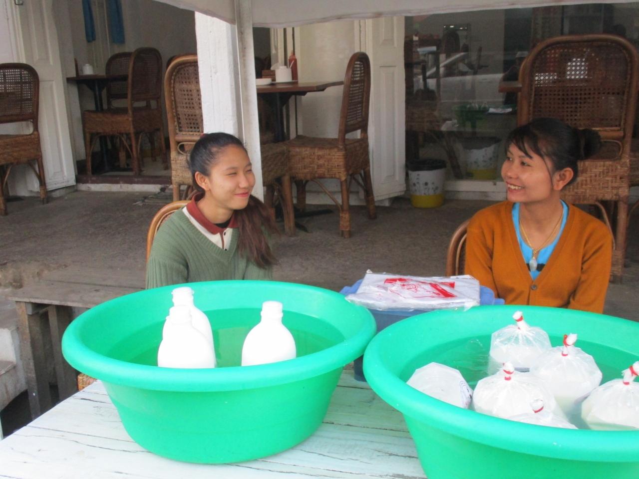 店の前でミルクを売っている。 -