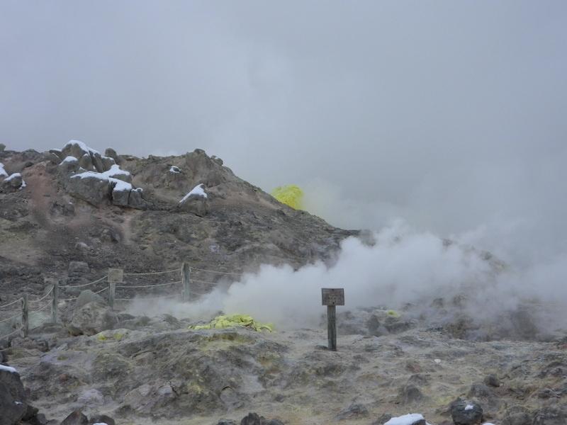 ご多聞に漏れず暖冬で雪が少ないという北海道ですが、ここはさらに地熱の高い地面がむきだし。硫黄の結晶もむきだし。寒いせいか針状になってきれい。