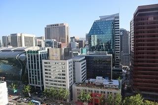 部屋の窓からの眺望。何てことないビル群ですが、ビルに書かれたハングル文字に、韓国感を感じました♪
