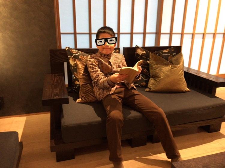 ロビーでチェックイン手続きを待ちます。いい子にするんだよ。