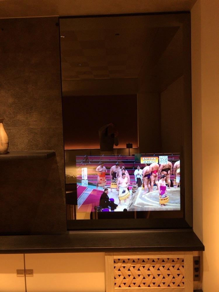 部屋の中には、ぱっと見、テレビが見当たりませんが、目ざとい子供がリモコンを見つけ、電源ボタンを押したら、鏡の下部に突如スクリーンが現れました。星野リゾートでは、ゲストに非日常感を味わってもらうため、基本的にはテレビはおかないのだそうですが、東京にはビジネスマンも多いということで、例外的にテレビを置いているのだそうです