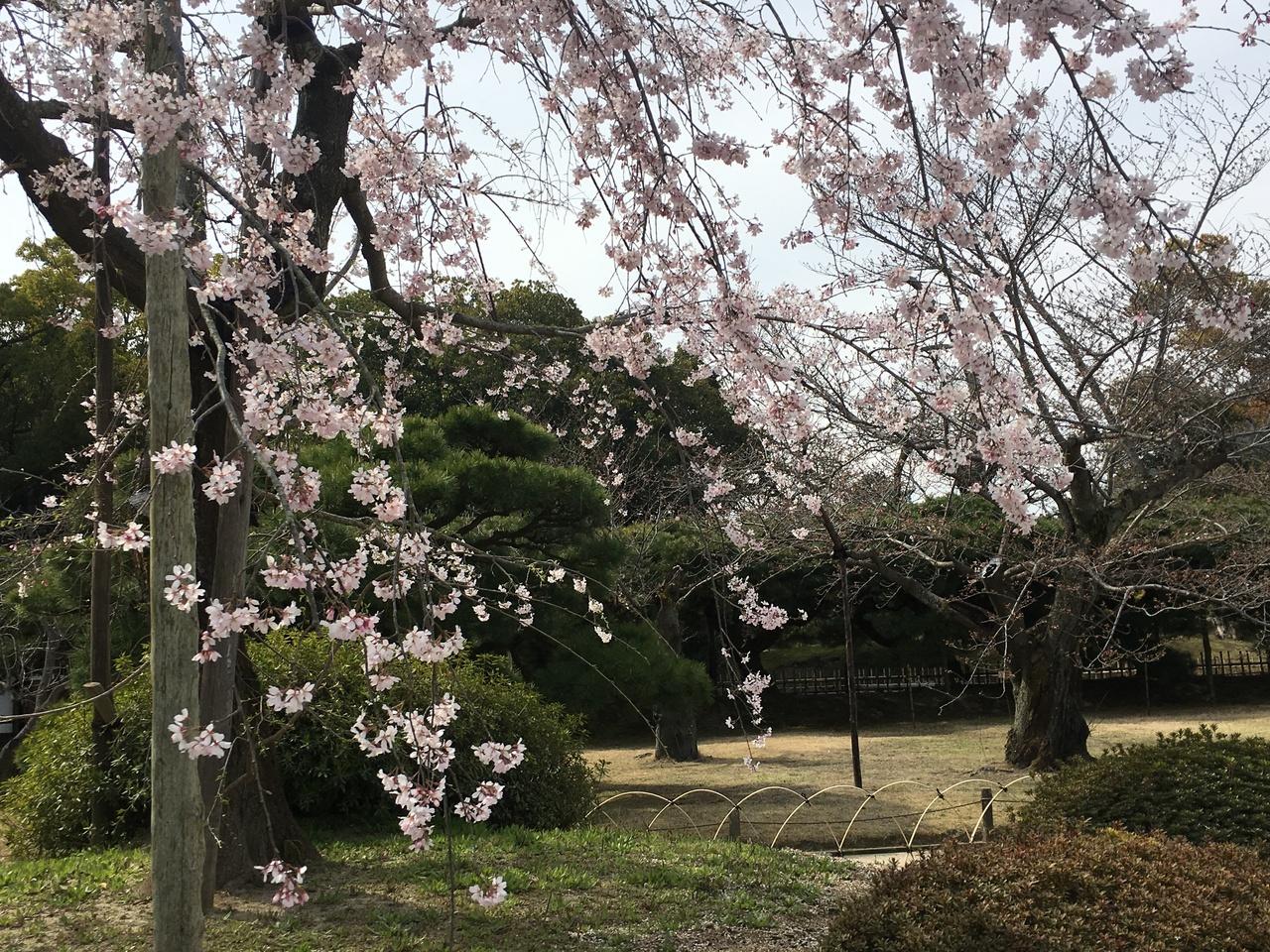 とにかく広い、松がいっぱい。桜もきれい。結婚式の写真を撮りに来ている紋付袴と白無垢の新婚さんがいっぱいいる。これもまた絵になる。