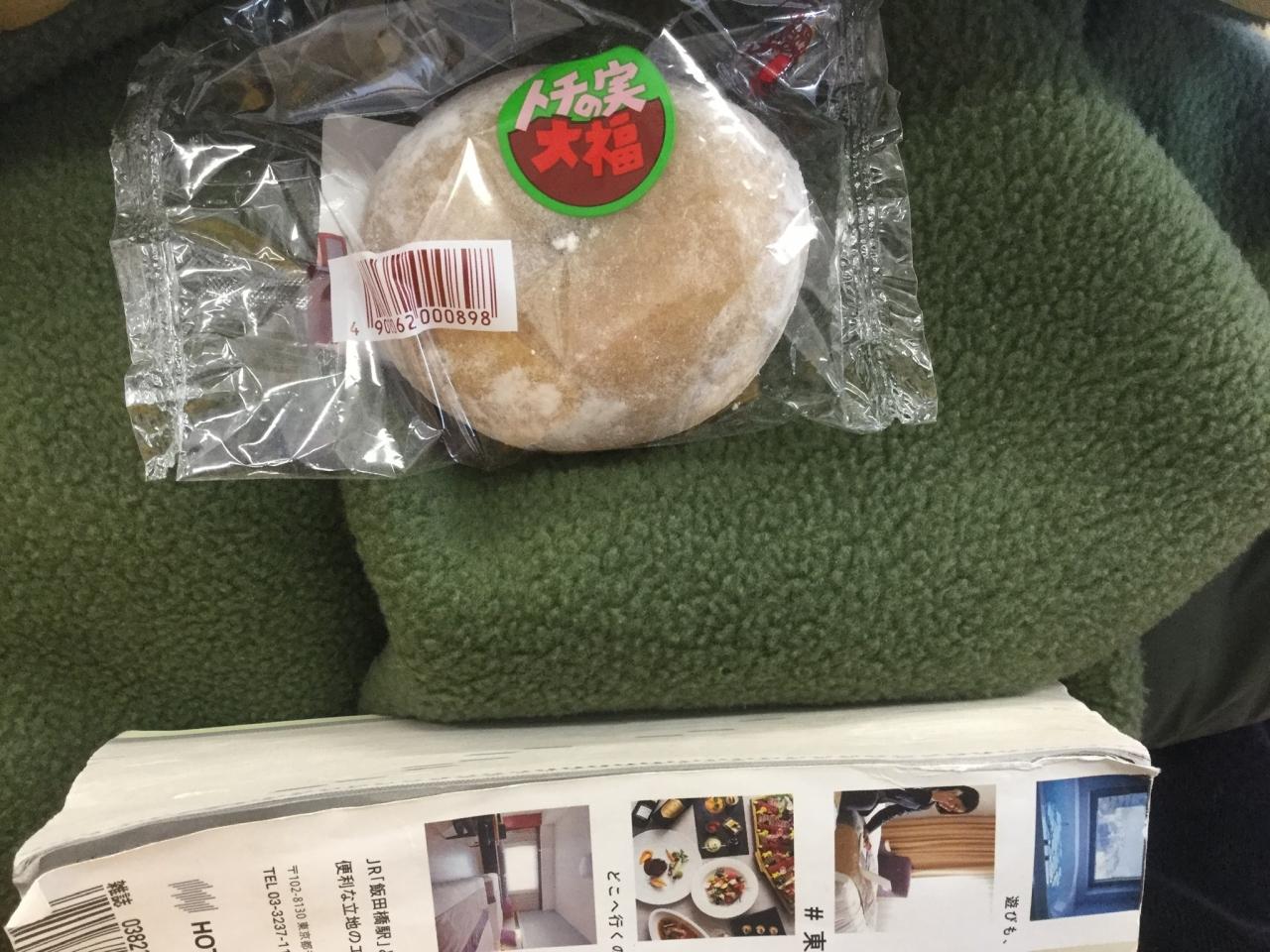 6日目 会津若松駅の前のスーパーで買った大福とお世話になったポケット時刻表。