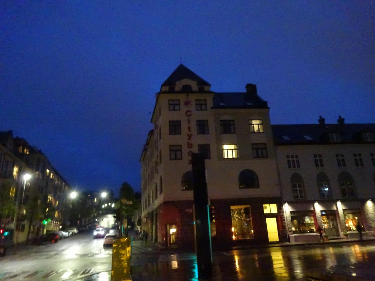 40分ほどでベルゲン駅前に到着、降りると雨が降っていました。傘を出すのも面倒なので濡れながら大荷物を引き摺ってホテルへ向かいます。
