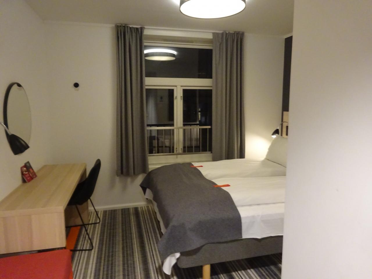 ホテルは駅から10分かからないところにありました。何でも価格が高い北欧にあって結構抑え目価格のホテルですが、その訳が分かりました。基本フロントは無く、予約のメールや印刷した紙に書いてある予約番号で鍵の受け渡しを行います。初めてなので戸惑っている人にはボタンを押すと係員が出て来てチェックインのタッチパネル操作を教えてくれます。カードでの支払いが終わるとカードキーが出て来るという仕組みです。係員に教えてもらいながら何とかできました。