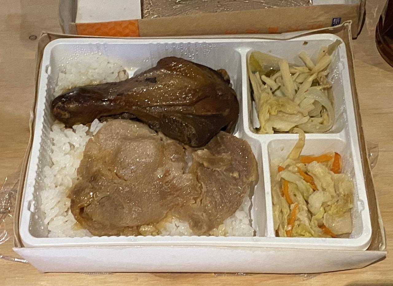 車内で食べ損なった鶏腿&豚肉のお弁当です。 -