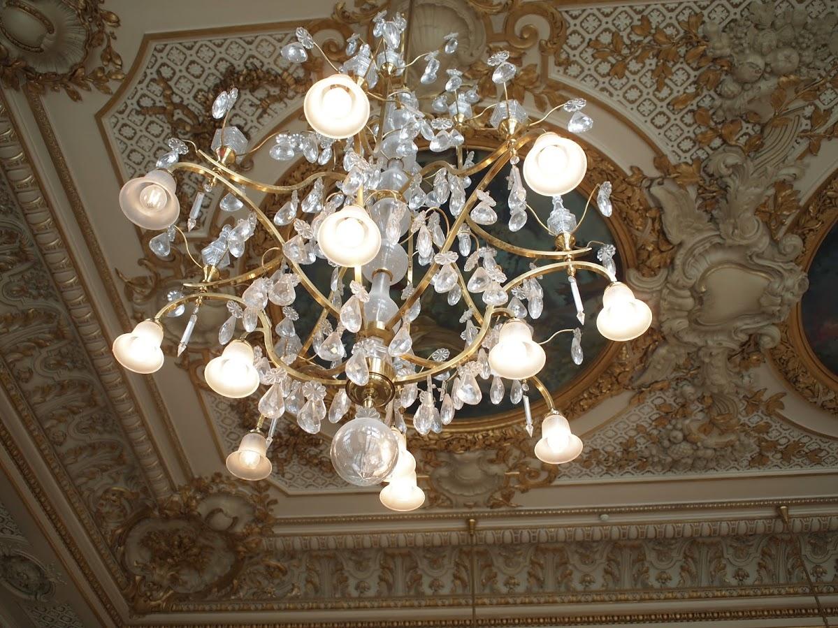私達の頭上にはこんなシャンデリアが。高級な雰囲気でありながら、スタッフの方はとても気さくです。