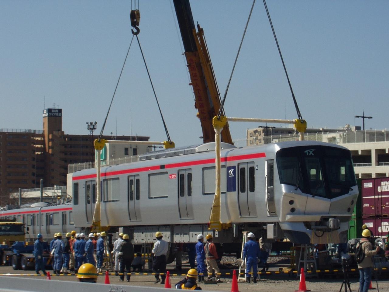 既に交直流電車のTX-2000の先行試作車であるトップナンバー編成が土浦貨物駅の留置線に入り、クレーンで吊る準備をしています。 -