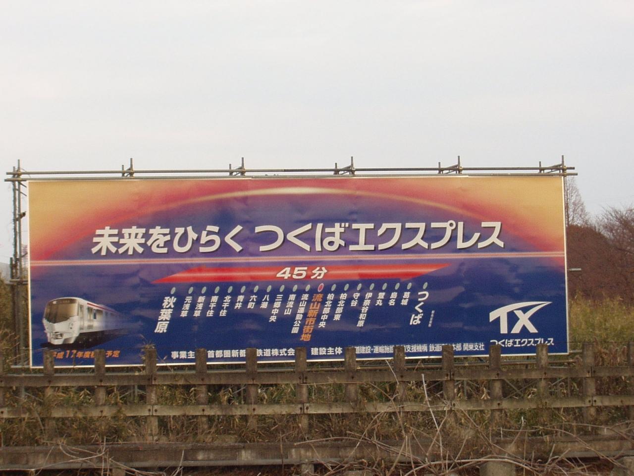 計画当初に作られた「未来をひらく つくばエクスプレス(常磐新線)」の看板です。後に下の看板に変えられていきます。
