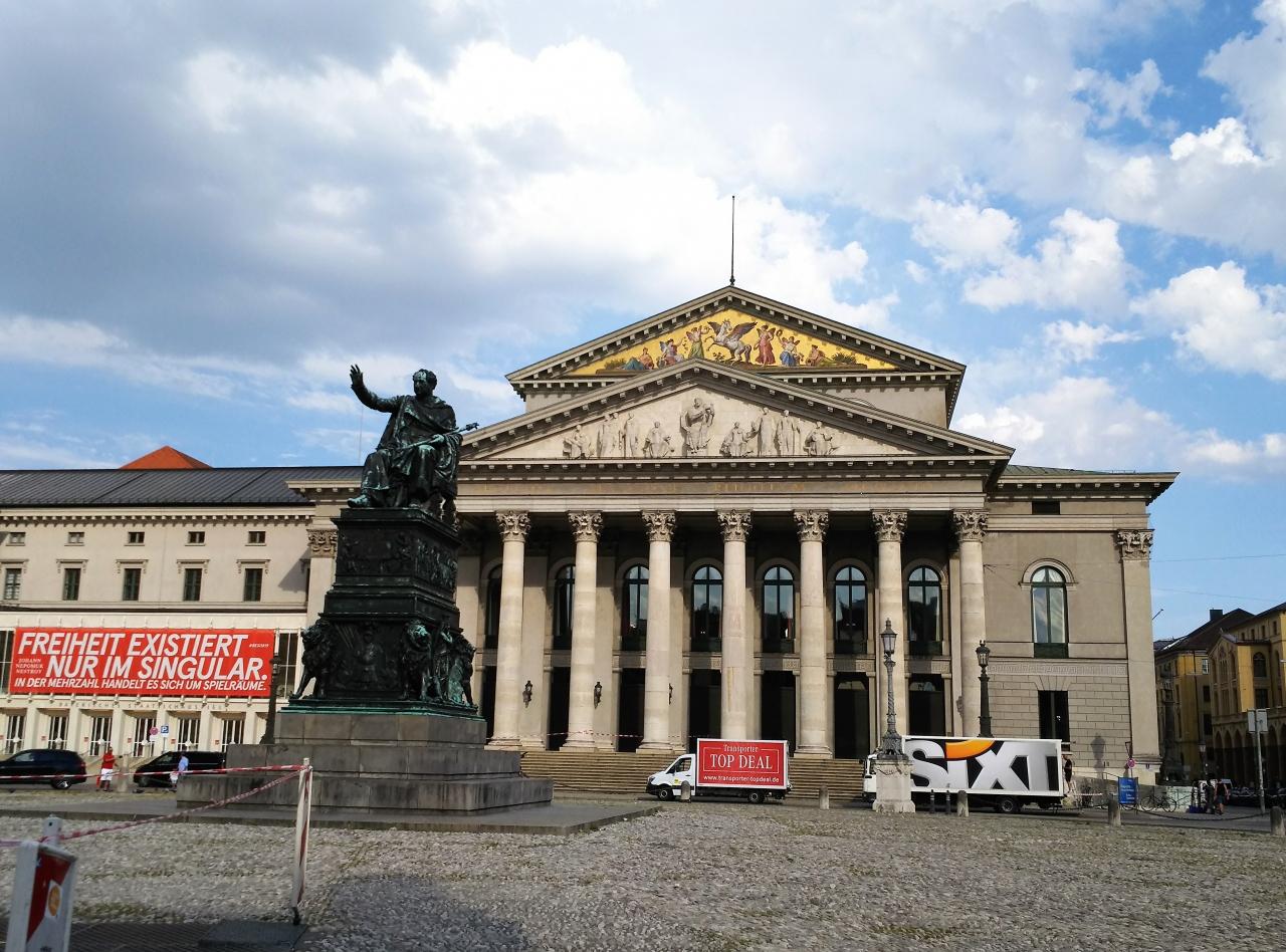 向こうにはパルテノン神殿風の豪華な建物が見えます。こちらはバイエルン国立歌劇場。1818年創建だそうです。 -