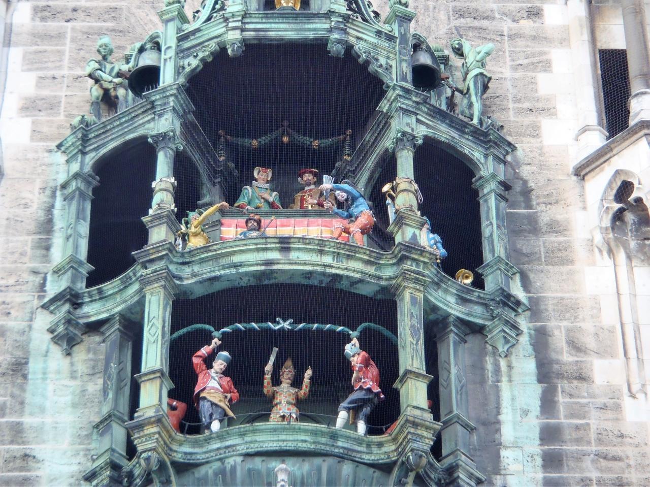 下段は、16世紀初頭にミュンヘンを襲ったペストの終焉を祝い、陽気に歌い踊った樽職人をモデルにした謝肉祭の踊り。人形がくるくると回ります。 -