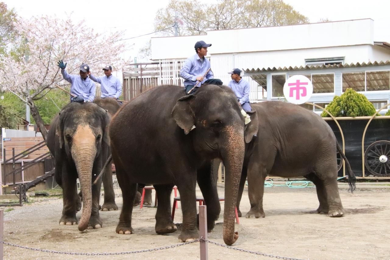 ぞうの国では桜は見頃を過ぎていましたが、はらはらと舞い散る中で、桜じゅうたんの美しい観客席から、ぞうさんショーを見ることができました。