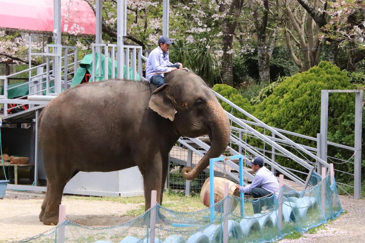 ぞうさんショー会場ではまだ桜が残っていて、ショーの後のエサやり体験タイムには、桜の下のぞうの親子が見られました。