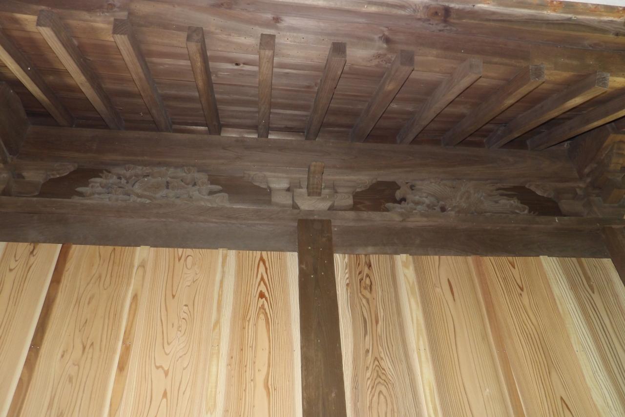 現在の社殿は廃仏毀釈の嵐の中で再建されたのであろう。拝殿の彫刻は手が込んでいる。拝殿向拝の木鼻は象と唐獅子であるが、拝殿の角柱の木鼻は龍である。このような龍の木鼻は初めて見た。それでいて拝殿、本殿ともにこれ以外の木鼻は禅宗様の簡素化されたものである。また、どういう訳か本殿後ろの角柱の木鼻の一つがない。