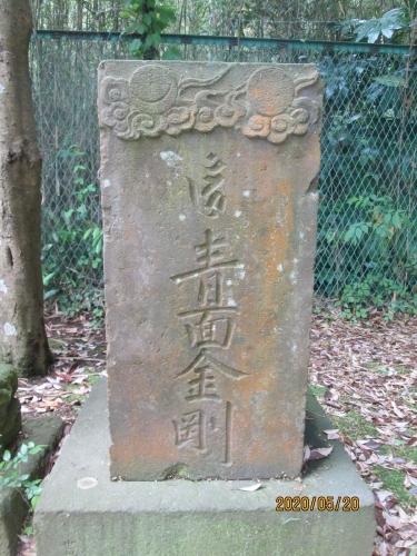 六臂合掌青面金剛塔。餓鬼を踏んで下部に三猿。