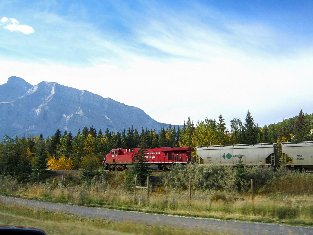 10時頃にバンフのスーパーを後にしてキャンモア方面に向かいます。国立公園のゲートを出てキャンモアまで右手に貨物列車が並走しました。 -