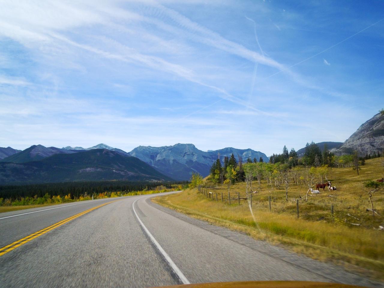 10:00にバンフを出て、まずトランスカナダ・ハイウェイ1号線でキャンモア方面に向かいます。4日前の9/25と同じくキャンモアの先で左手にヤムナスカの山並みが見えてきたらトランスカナダ・ハイウェイを降り、ハイウェイ1Xに入って北に進みます。 -