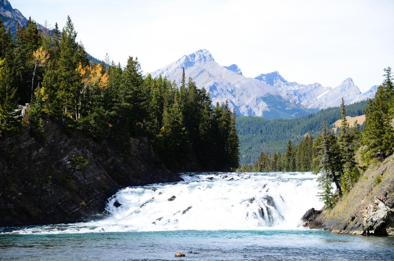 ボウ側の南岸に渡りフェアモント・バンフ・スプリングス・ホテルのの下の川原に降りるとボウ滝が見えます。