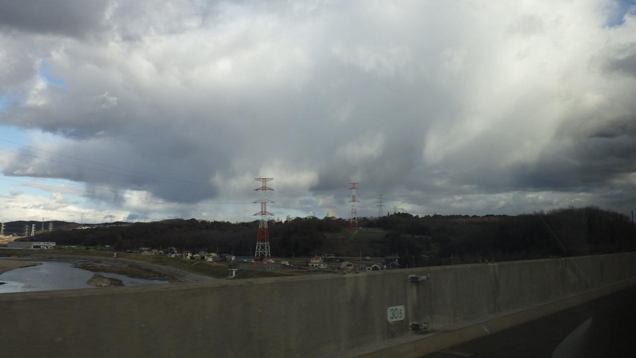 曇り空に虹らしきものがチラリと見えます。