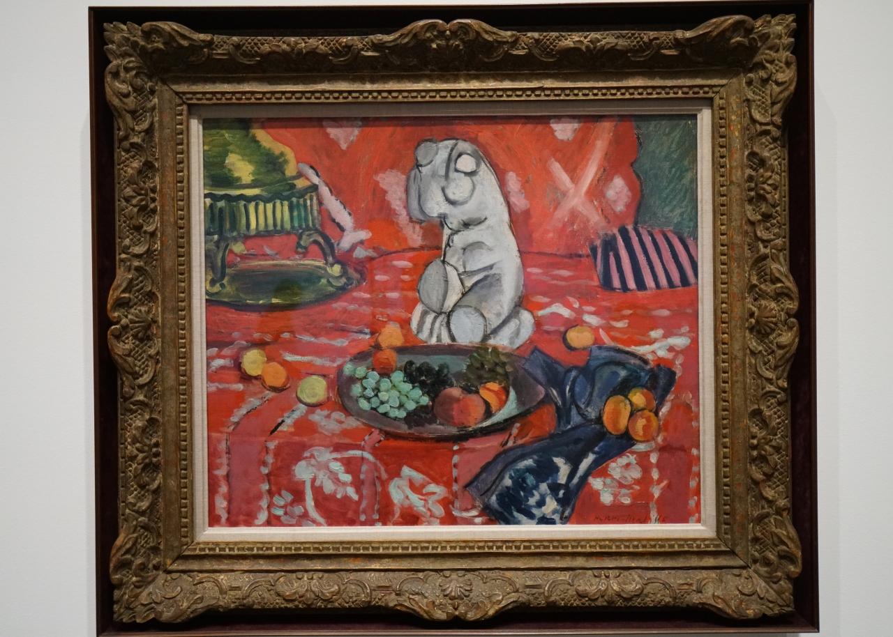マティスは人物画を得意としていましたが、静物画にも積極的に取り組みました。鮮やかな赤色が目を引く、この作品の無造作に置かれた果物や中央に石膏像を配した構図は、セザンヌからの強い影響を想起させます。※本展覧会での写真撮影ではありません。 -