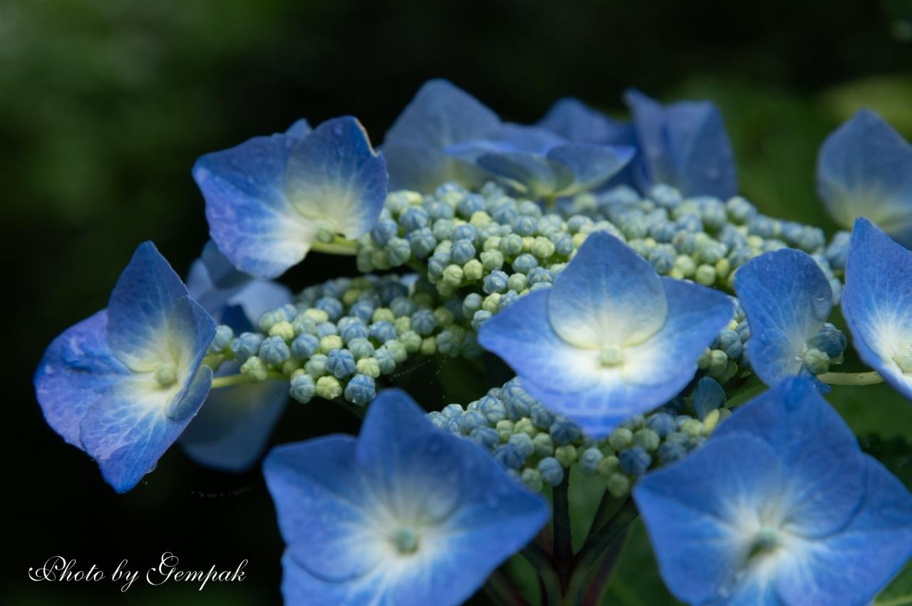 「タフスタッフ」というガクアジサイ系の品種。梅雨時の代表的花の紫陽花は、雨滴が似合う。