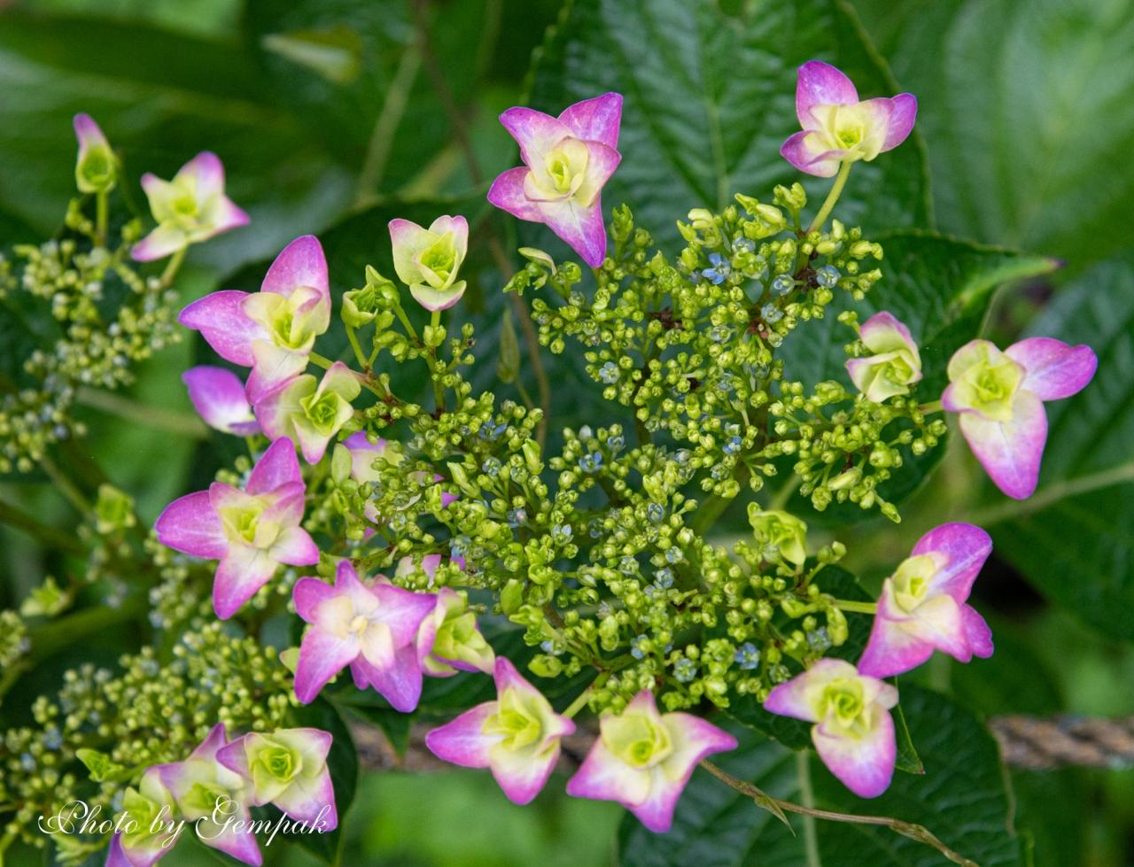 「ベニガク」という品種のガクアジサイ。セイヨウアジサイのような派手さはないが、紫陽花原種に近い花の形が趣がある。