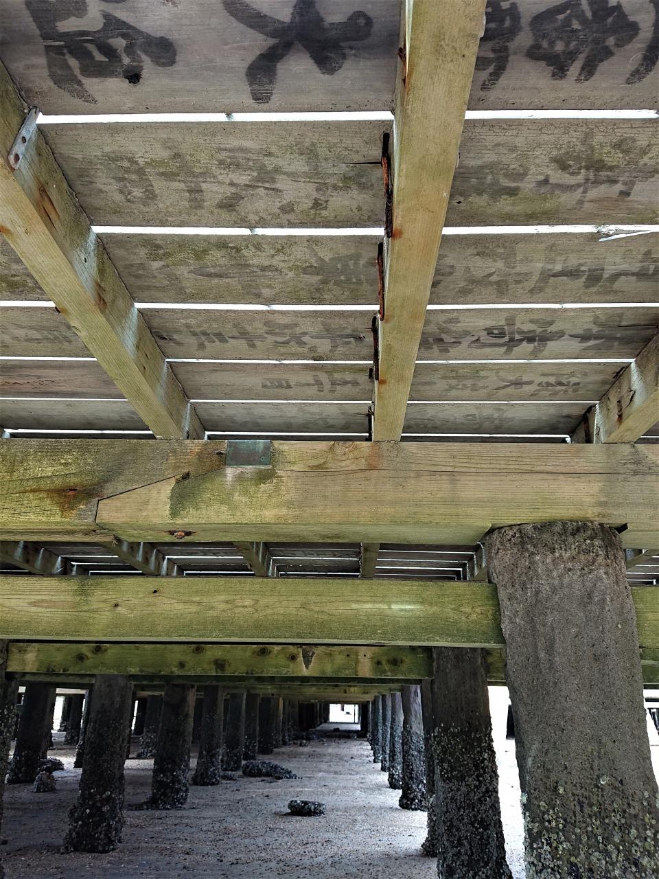 浜から見るのが気に入ってまた降りてみる。回廊の下を覗くと、床板に字が書いてあるのを発見。流石世界遺産、ただの板に非ず(詳細は解らず)