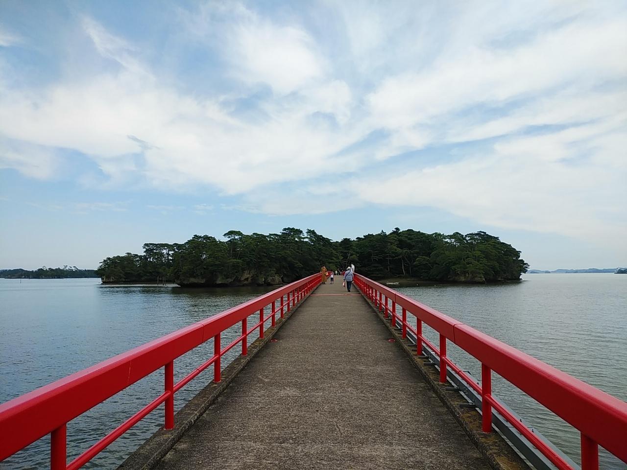 橋の入口から赤い橋と、その先の松島湾の中では大きい福浦島の光景は見事ですね!