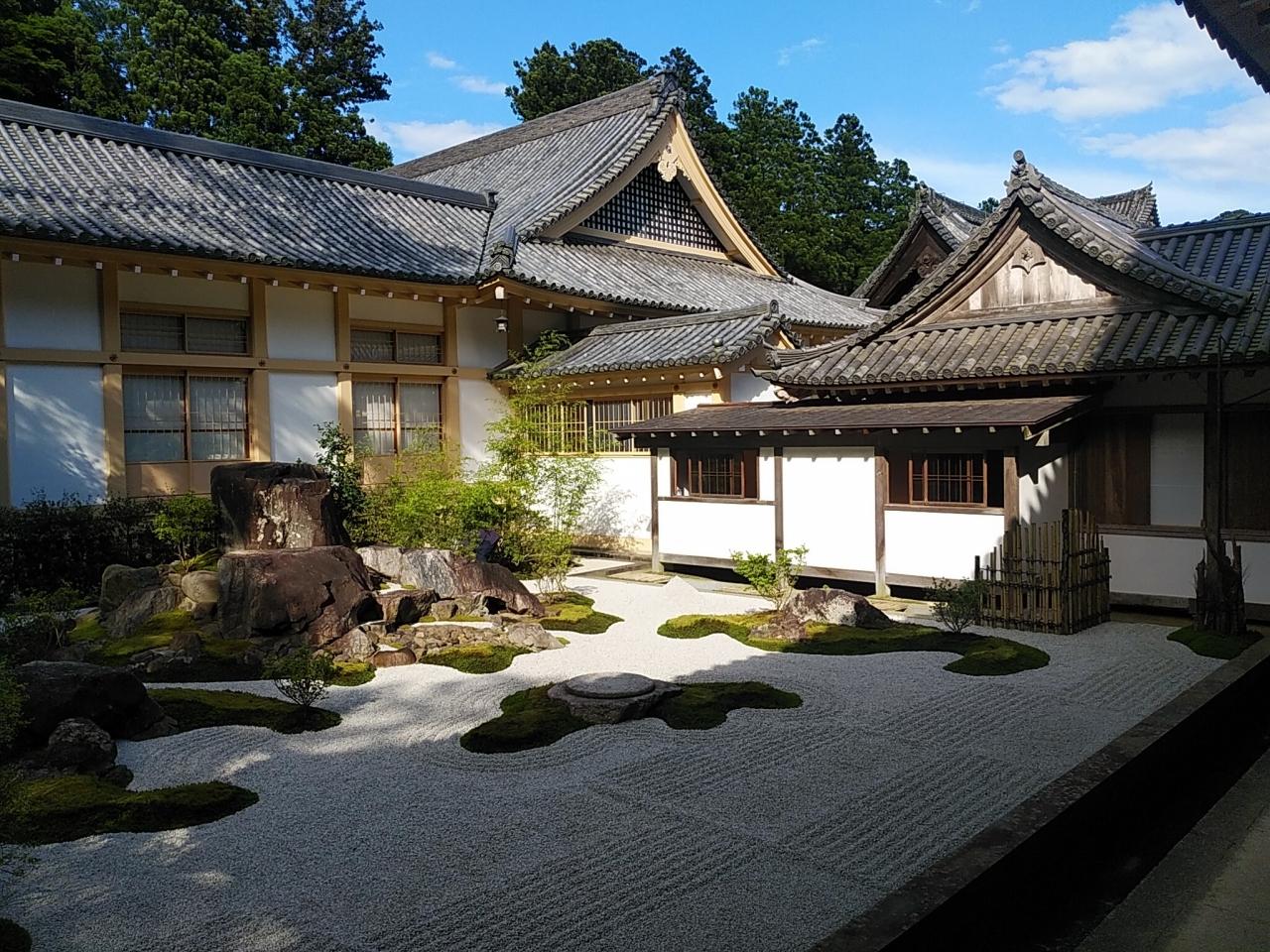 庫裡から本堂を眺めます。実に壮大で美しいです!庭園もほとんどは砂利ですが、それでも広大で美しいです!