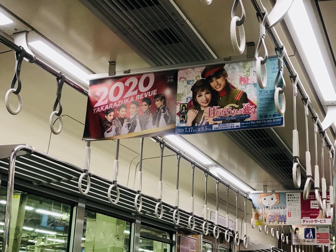 座った座席のそばには宝塚の吊り広告☆阪急宝塚線 乗り物