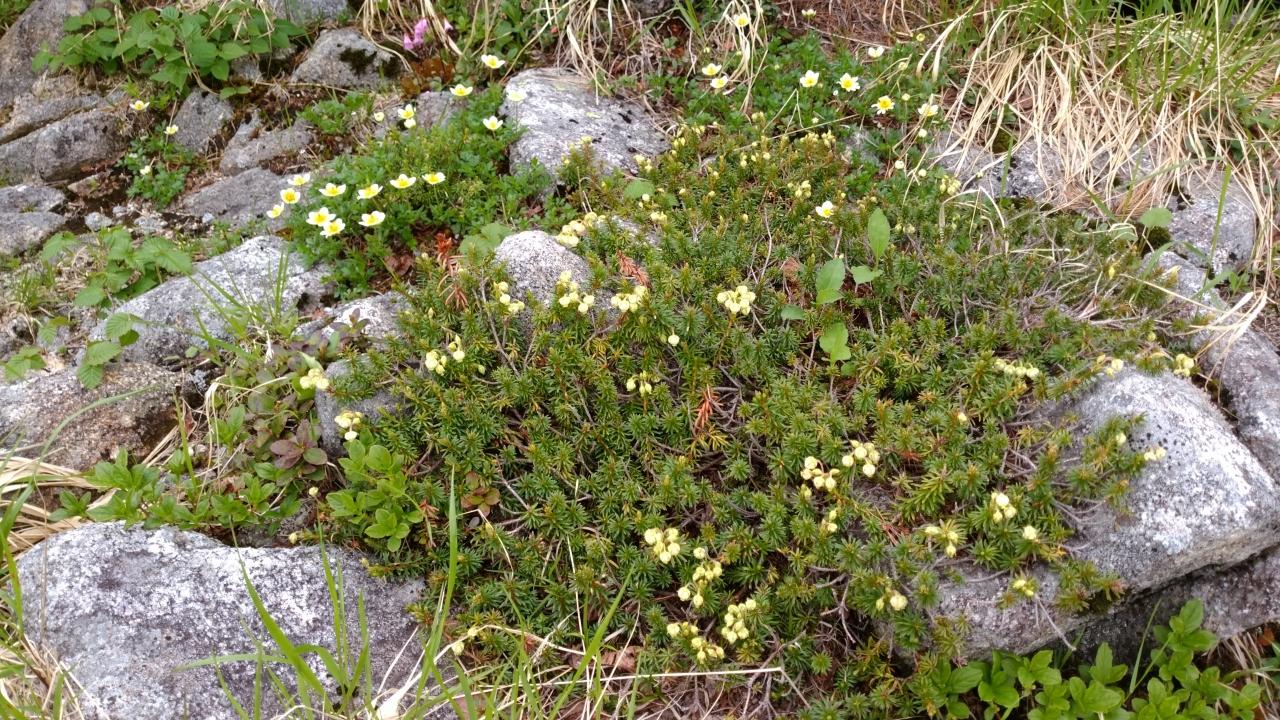 右の下向きの丸い花は、アオノツガザクラ。左奥、チングルマ。