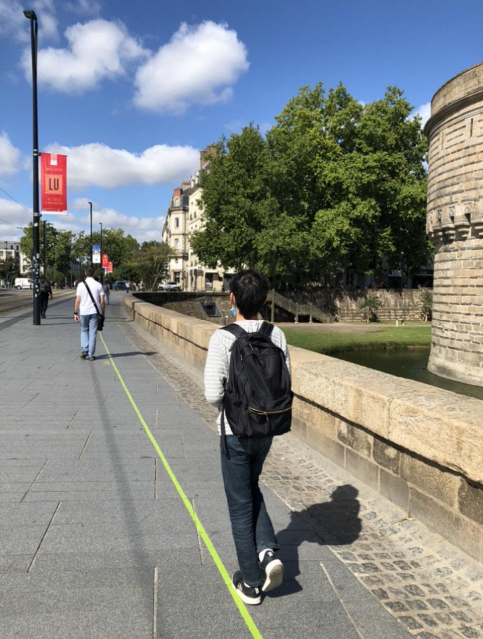 地面に緑の線が引いており、それについて橋を渡ります。