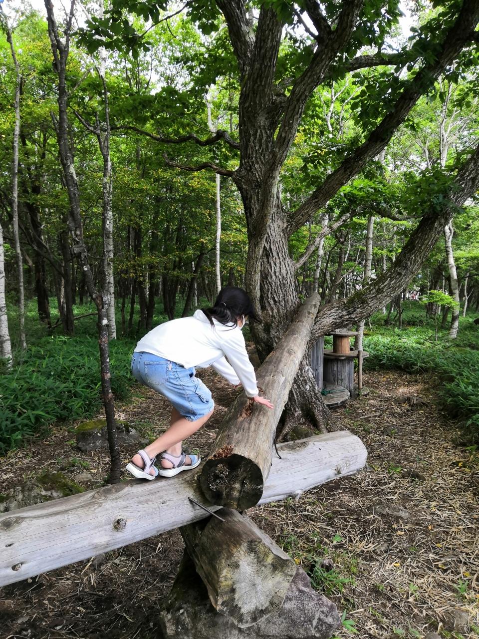 森の中にアスレチックパークがありました。早速トライ。