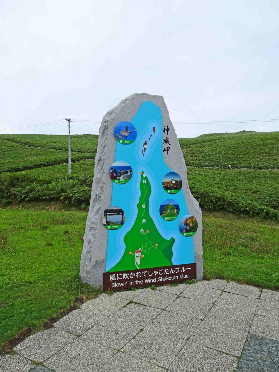 積丹の碑。 遠くに神威岬先端の神威岩が見えます