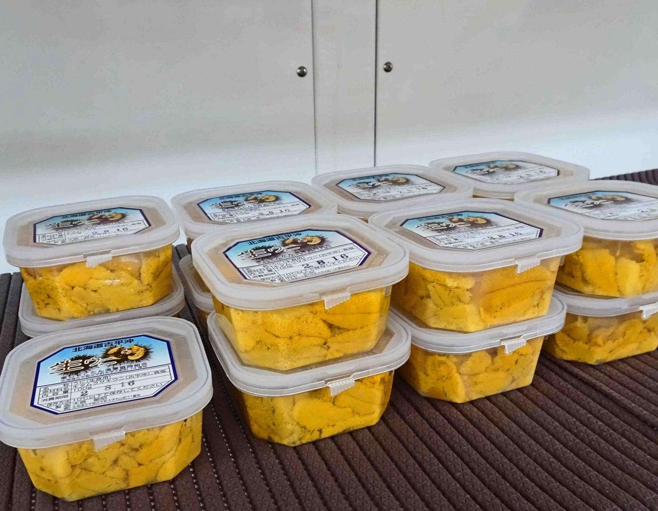 朝なのでまだ商品を並べ切れていないようですが、雲丹だけは出てきました。 利尻産馬糞雲丹とあります。 よく言う積丹付近の色鮮やかな馬糞雲丹とは少し色合いが異なります。