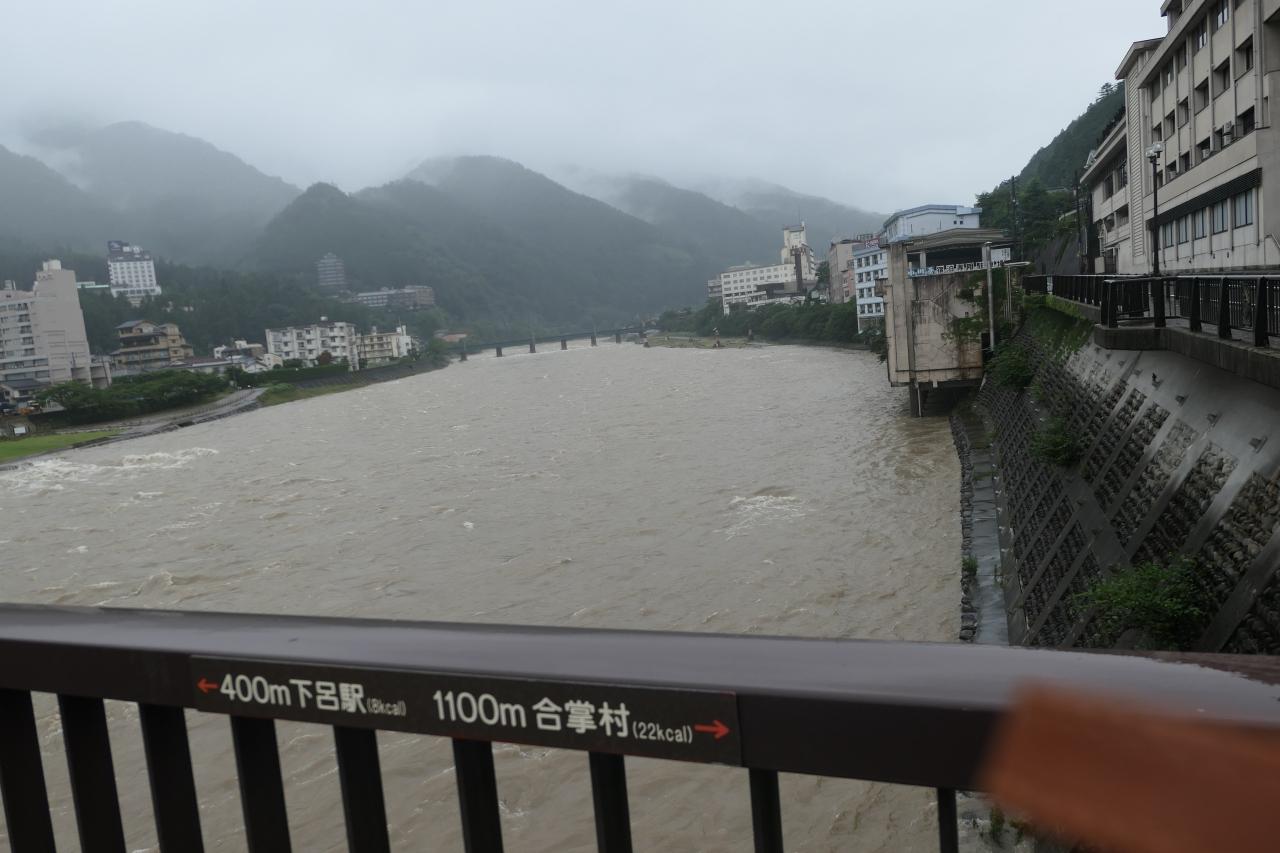 本来なら左側は公園になっていて露天風呂があったはずですが、連日の大雨で飲み込んだ状態になっています。